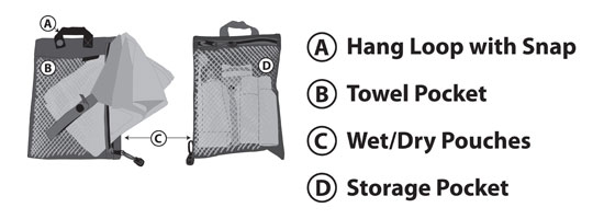All towels feature a snap loop for easy hanging and include a deluxe wet/dry storage bag with 2 zippered compartments for your wash kit items.