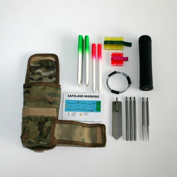 - 25 coloured marker pegs with additional tactile and visible markings to clearly mark the location of a device (Red), or cleared ground (Green).