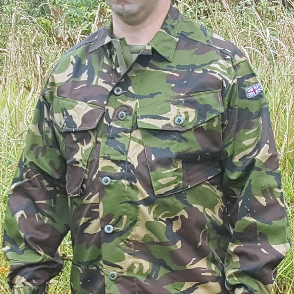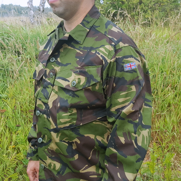 Cuff adjustment is by 2 small buttons provided at each wrist. The sleeves were often worn folded up above the elbow in summertime around garrison or partially rolled up for warm weather combat operations. A small Union Jack flag is sewn to left upper sleeve denoting the wearers UK nationality.