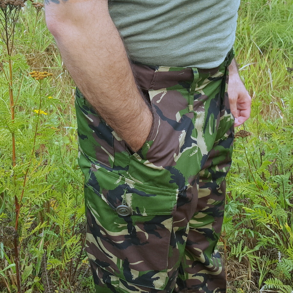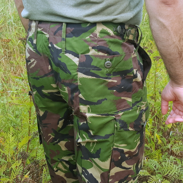 Two front hip pockets are provided as well as a button fastening right rear pocket. Cargo pockets on each leg are fastened by large slotted buttons. Big enough for maps and planners, their cut allows for expansion to accept larger items.