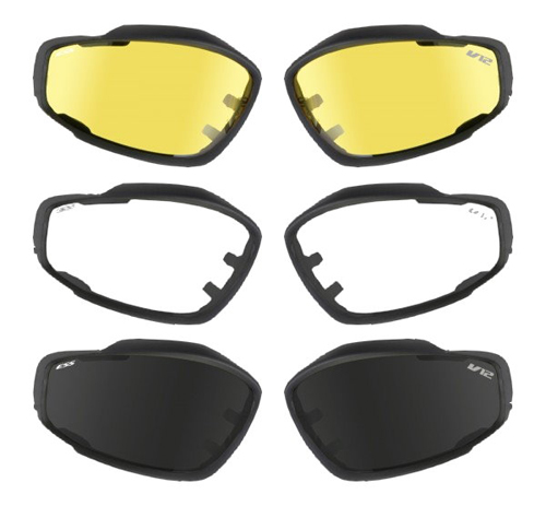 The Advancer V-12's 2.8mm polycarbonate high-impact lenses are fully interchangeable, providing the ability to quickly adapt to any light condition or replace damaged lenses. Replacement lenses are available in Hi-Def Yellow, Clear, and Smoke Gray. All Advancer™ lenses provide 100% UVA/UVB Protection.