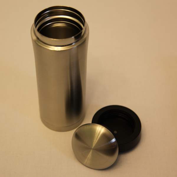 This stainless steel insulated mug has a screw cap that can be opened with just half a turn. The cap is sealed to prevent leakage and has a small compartment on top that can hold sugar packets or teabags.
