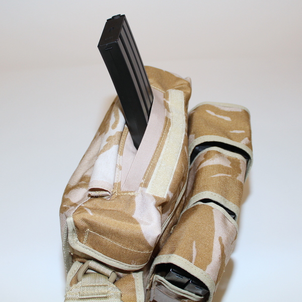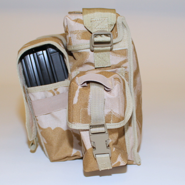 Supplied with a fully adjustable shoulder strap with comfort pad, this strap is removable if required. The bag features a large main compartment, 3 triple 30 round 5.56mm magazine pockets on the outside as well as two HE and one smoke grenade pocket on the ends of the bag. The main compartment can be used to secure empty magazines when required, holding them securely without loss.