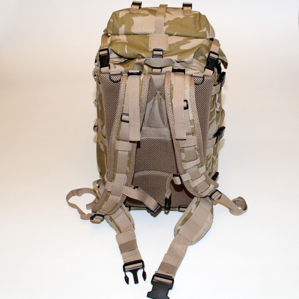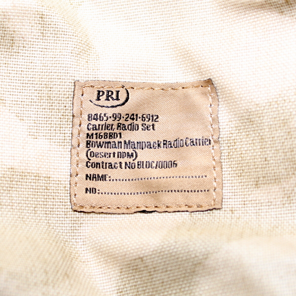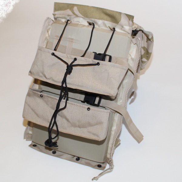 This Daysack was designed for use with the latest UK Radio system, BOWMAN. The back panel is designed to secure man portable radios with straps, ties, and pockets. Radio operators use what they need and fold away what they don't. The back panel may be used on its own to carry radio equipment without the main load carry compartment attached.