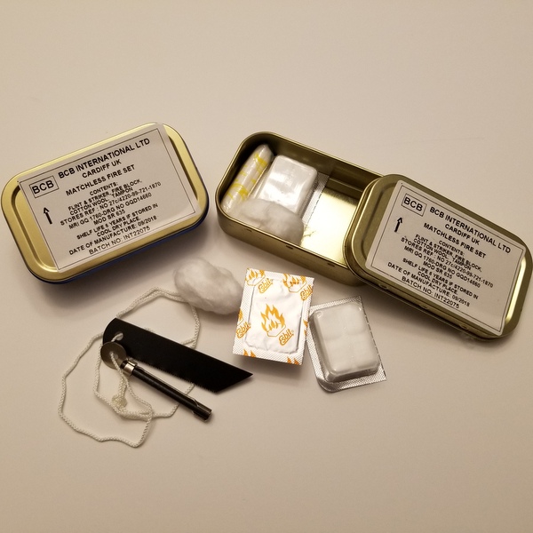 Manufactured in the United Kingdom specifically for Royal Air Force survival kits, these Matchless Fire Sets are Military approved items and come packed in a handy metal tin. Included in the kit are solid fuel blocks, cotton wool tinder, a tampon also used as tinder and a flint and steel striker. These kits are also carried by Army troops who value its compact size and the ability to use it to get a fire started super quickly.